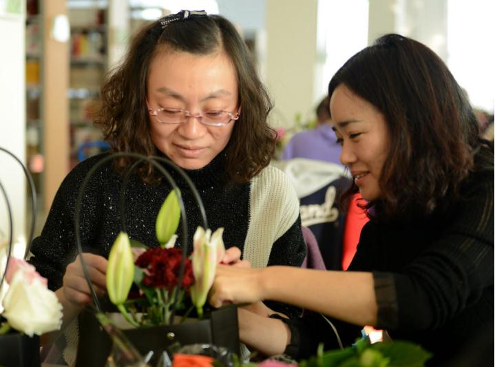 剪刀在大家手中飞舞,一支支鲜花在每个人手中重生,大家把手中的鲜花赋予了生命,更赋予了最美好的祝愿。
