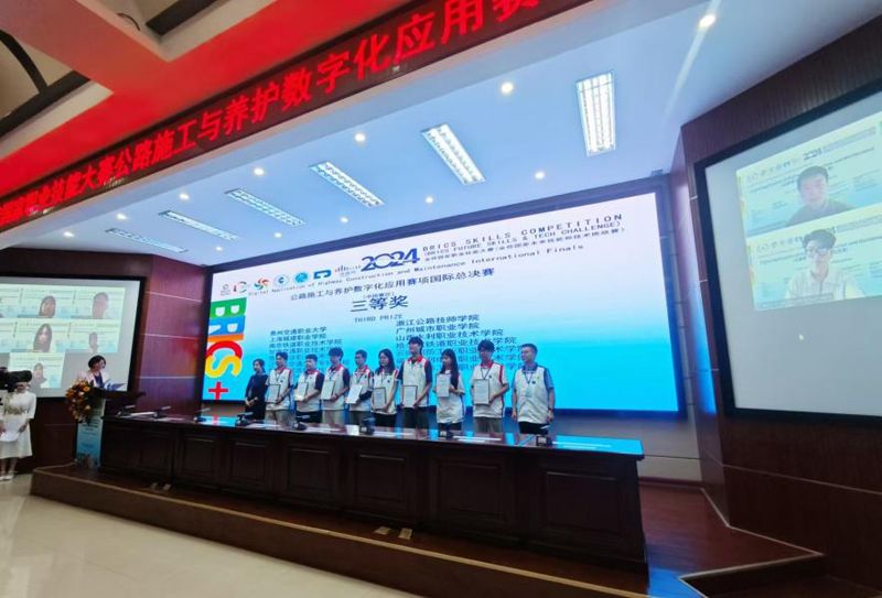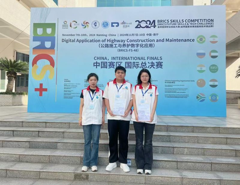 11月7日-10日,2024金砖国家职业技能大赛公路施工与养护数字化应用赛项国际总决赛在广西南宁广西交通职业技术学院举行,来自中国、越南、印尼、印度四个国家的47支参赛队伍的选手参加比赛。哈铁学院城市轨道工程学院王婷、王鑫老师指导的马爽、王一涵两名学生凭借扎实的专业技能、出色的团队协作获总决赛三等奖。